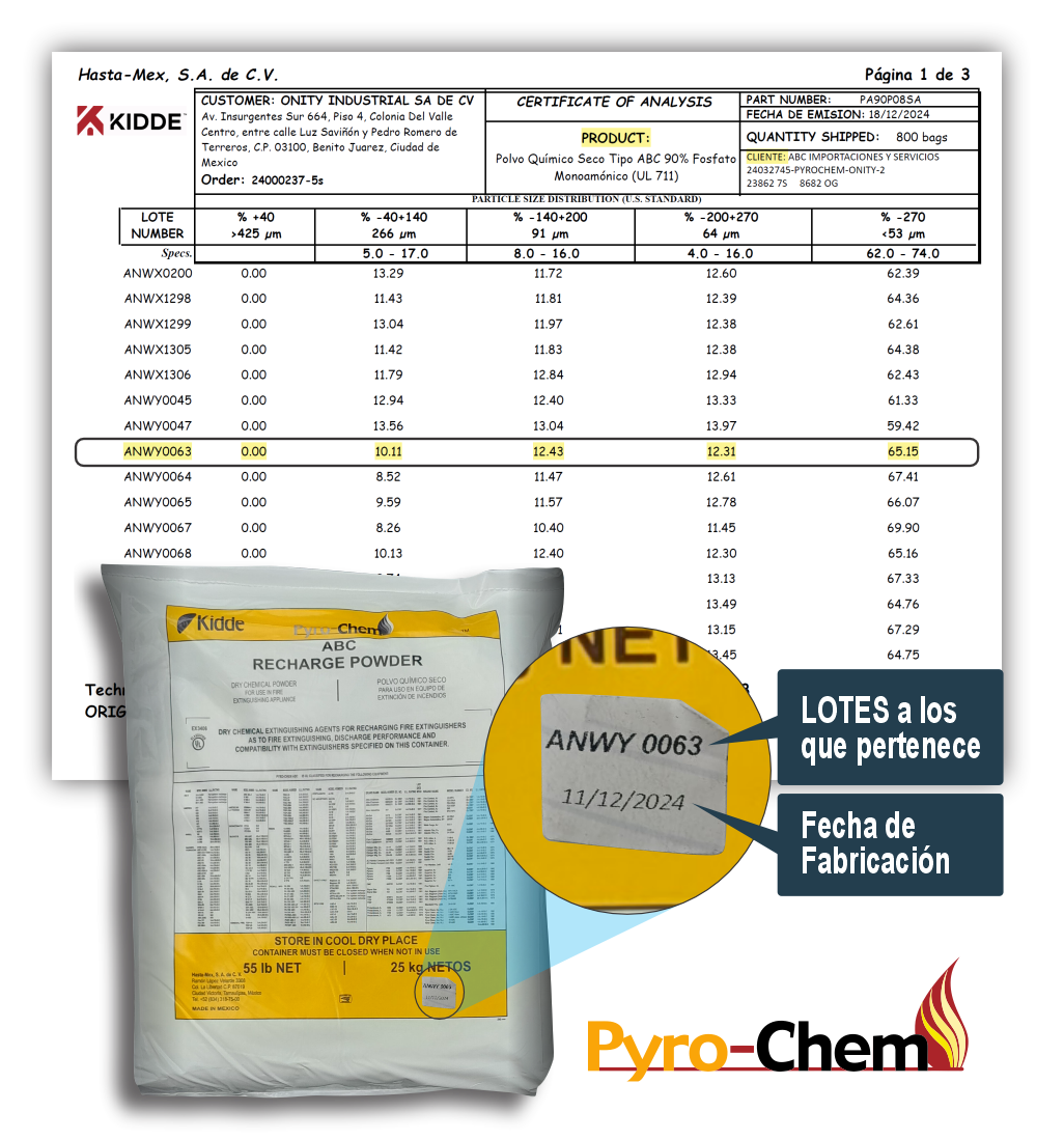 Pyro–Chem 90% UL, contiene 90% de concentración de fosfato monoamónico (MAP en inglés), la más alta concentración ofrecida por un fabricante de agente extintor polvo químico seco clase ABC y esta concentración esta certificada y la certificación es reconocida por INACAL.